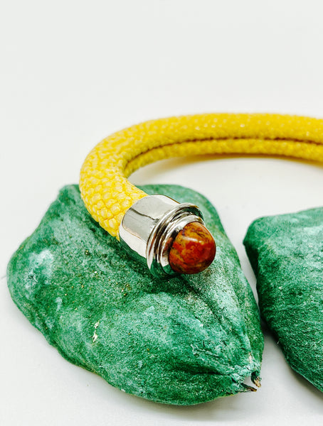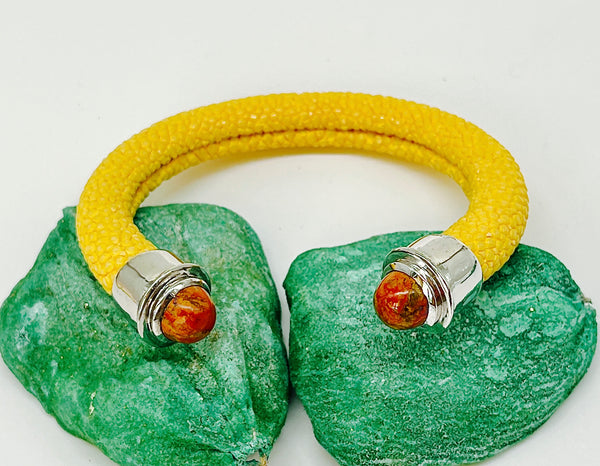 Luxuriöser Armreif aus Rochenleder handgefertigt! Besonders elegant durch die Silberenden mit edlen Jaspis-Cabochons! Flexibel biegbar passt dieser schöne Armreif an fast jedes Handgelenk ! Gerne mit anderen edlen Reifen zu kombinieren!